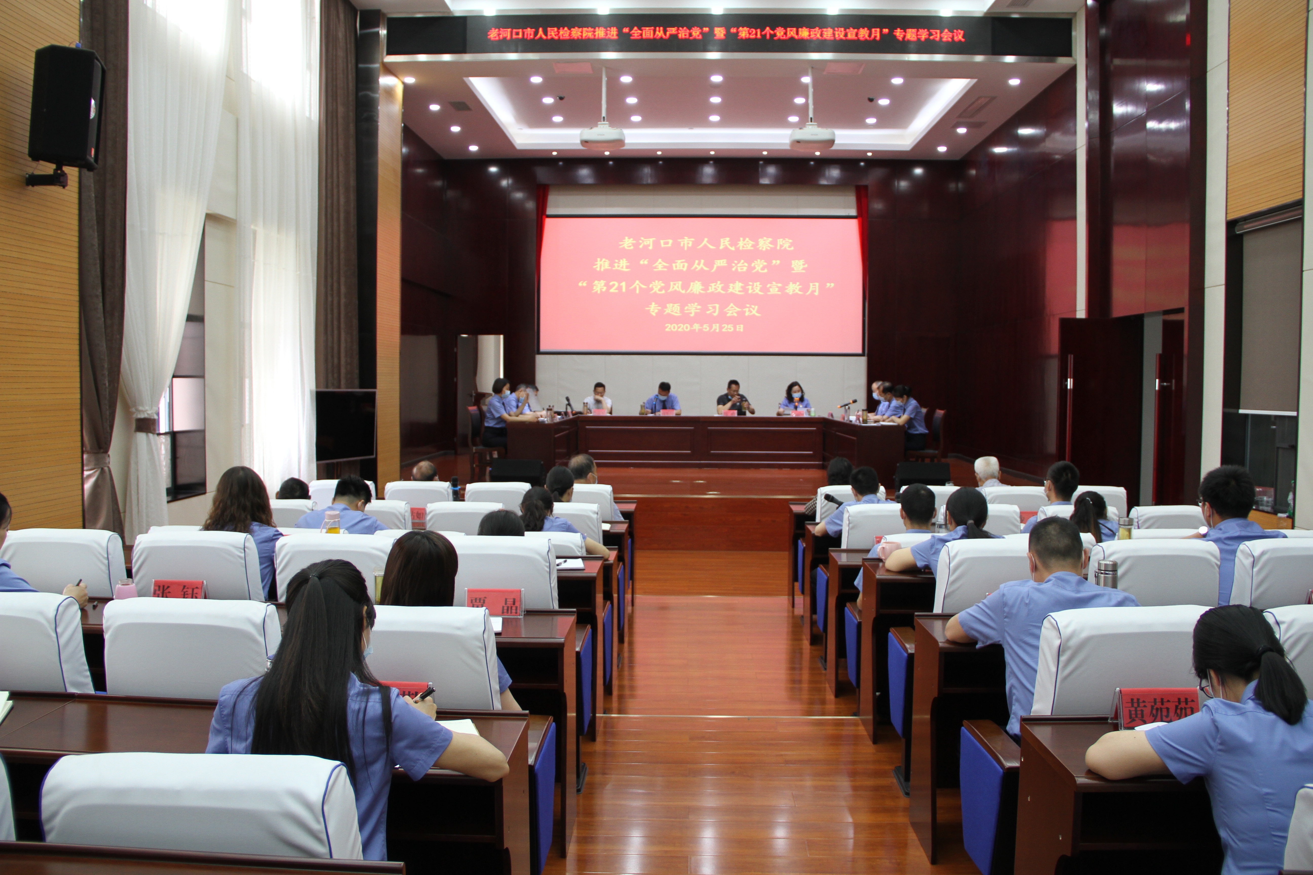 本网讯 (通讯员 陈爽)为坚决落实全面从严治党要求,深入推进党风廉政建设,5月25日上午,老河口市人民检察院召开推进“全面从严治党”暨“第21个党风廉政建设宣教月”专题学习会议,院领导,市纪委监委派出第二纪检监察组,院机关党委委员,机关各党支部书记,各内设机构负责人参加会议。